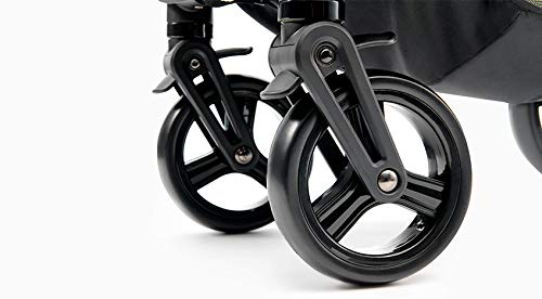 Le ruote di questo passeggino sono ammortizzate e realizzate in gommapiuma resistente, a prova di forature. Le ruote non necessitano di essere gonfiate e quelle anteriori girano a 360 gradi, facilitando in questo modo le manovre del passeggino. Sono dotati inoltre di un pratico sistema di blocco/sblocco, perfetto per usare il passeggino anche sui terreni dissestati e irregolari. Il telaio e la cappottina del passeggino conferiscono stabilità e sicurezza al passeggino durante la guida. Il passeggino è dotato anche di un freno centrale Stop & Ride, che si aziona dall’alto, molto comodo e funzionale da usare.