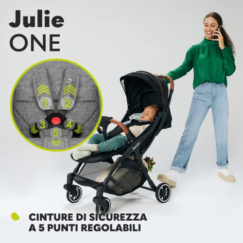 Il passeggino LIONELO Julie One è un modello che il marchio ha realizzato in diversi colori e che è caratterizzato da un rapporto qualità prezzo piuttosto buono. Si tratta di un passeggino maneggevole, molto compatto da chiuso e perfetto per un utilizzo quotidiano in città. Diciamo in città perchè presenta 4 ruote in gomma con ammortizzatori integrati piroettanti; le ruote però lo rendono adatto principalmente all'utilizzo su strada, mentre è meno adatto a terreni sconnessi e accidentati. Perfettamente sicuro per il bambino, grazie sia alla cinture a 5 punti che al freno di stazionamento integrato, questo passeggino sarà estremamente stabile sia in movimento che da fermo. La seduta è poi bella ampia e lo schienale è reclinabile, anche se c'è da dire che il meccanismo di inclinazione è un po' scomodo da utilizzare. Altro elemento vantaggioso è sicuramente dato dagli accessori in dotazione, tanti e vari, che vi permetteranno di farne un utilizzo più versatile. Anche se lo schienale risulta essere un po' rigido, il passeggino resta molto confortevole per il bambino. In più viene venduto ad un prezzo ragionevole ed in linea con le caratteristiche offerte. Si tratta di un modello che possiede diversi pregi e che può adattarsi a varie esigenze.